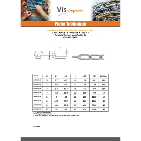 M Chaîne à maillon long Diamètre 1.5 Inox A4 (vendu au m)